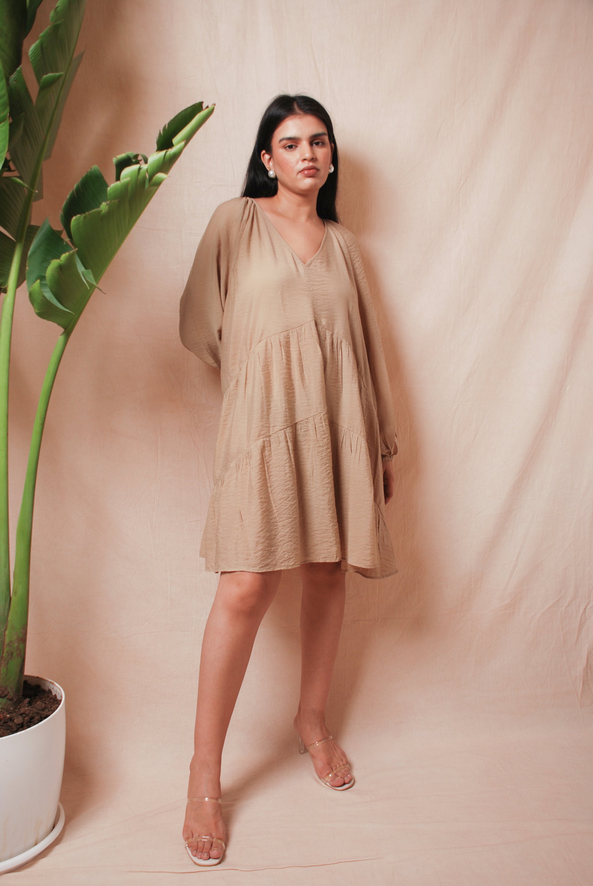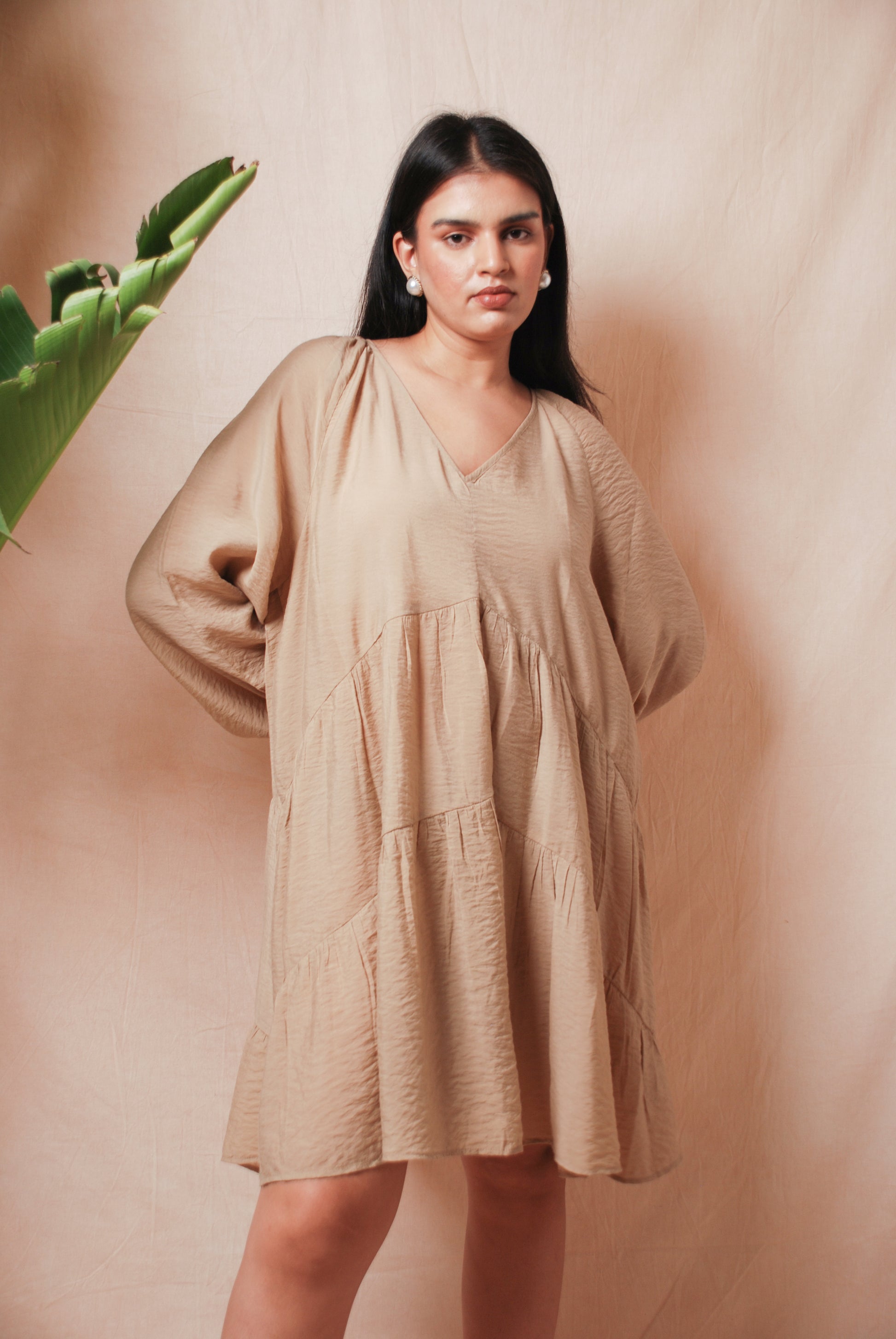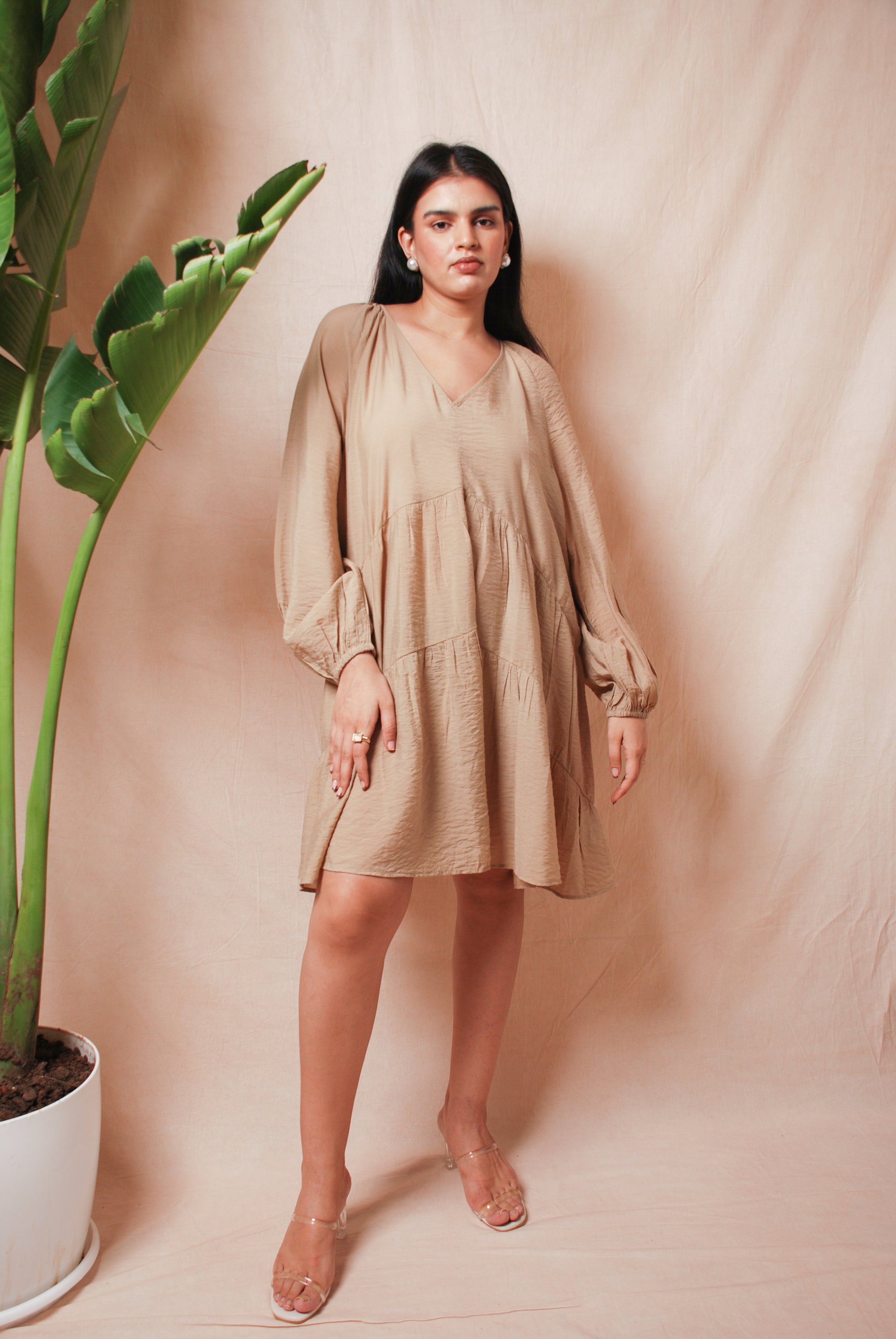 A beige toned casual summer dress with balloon sleeves and a v neck.