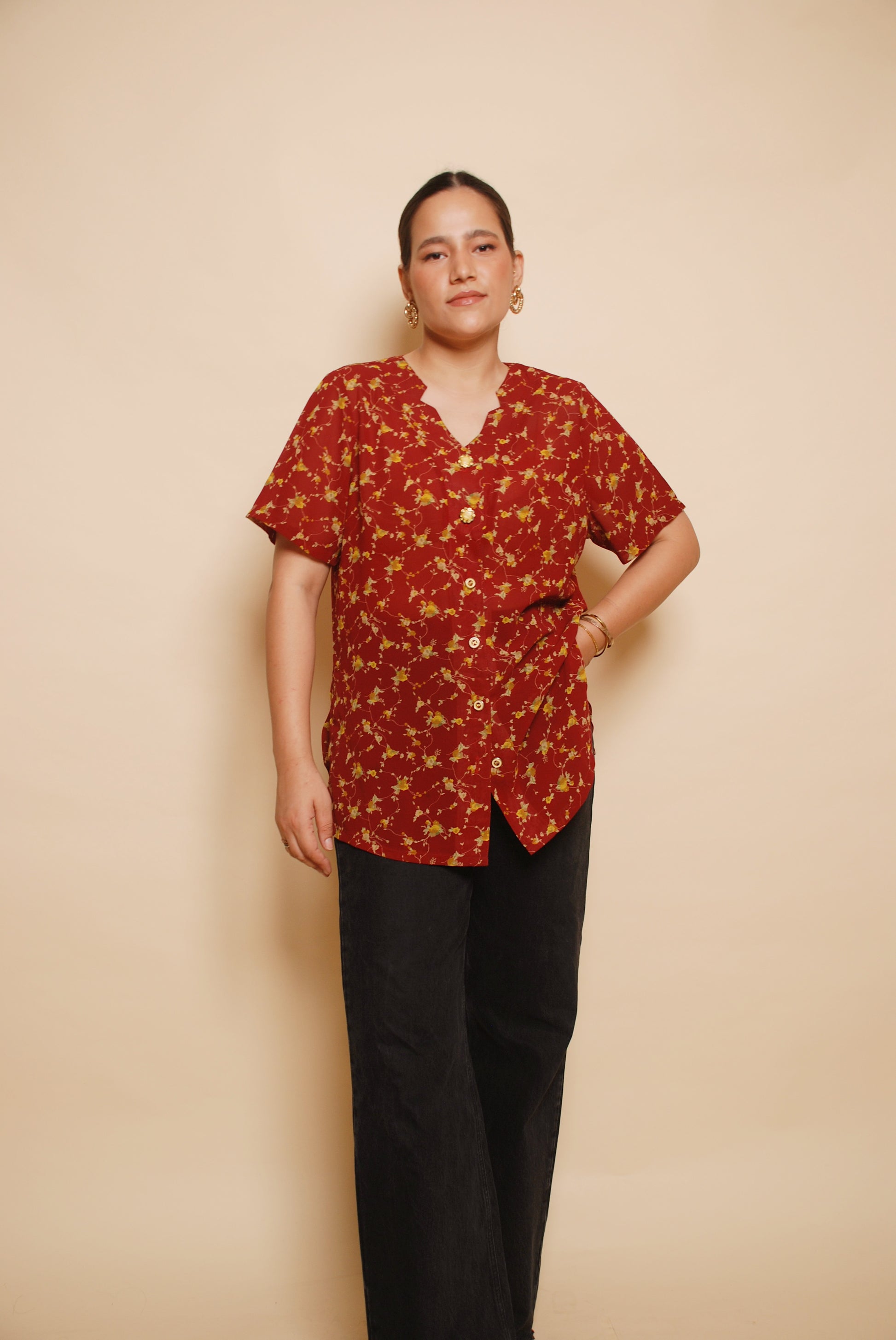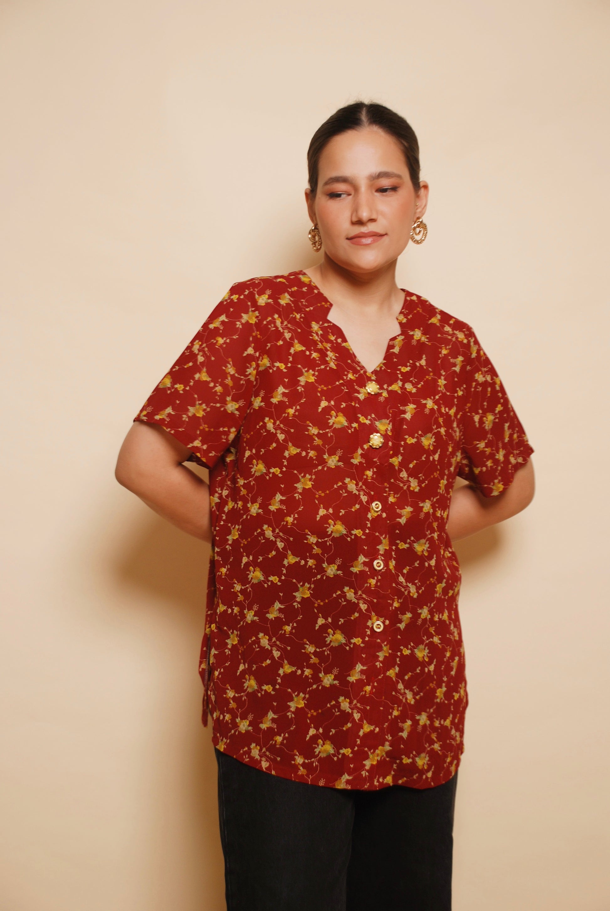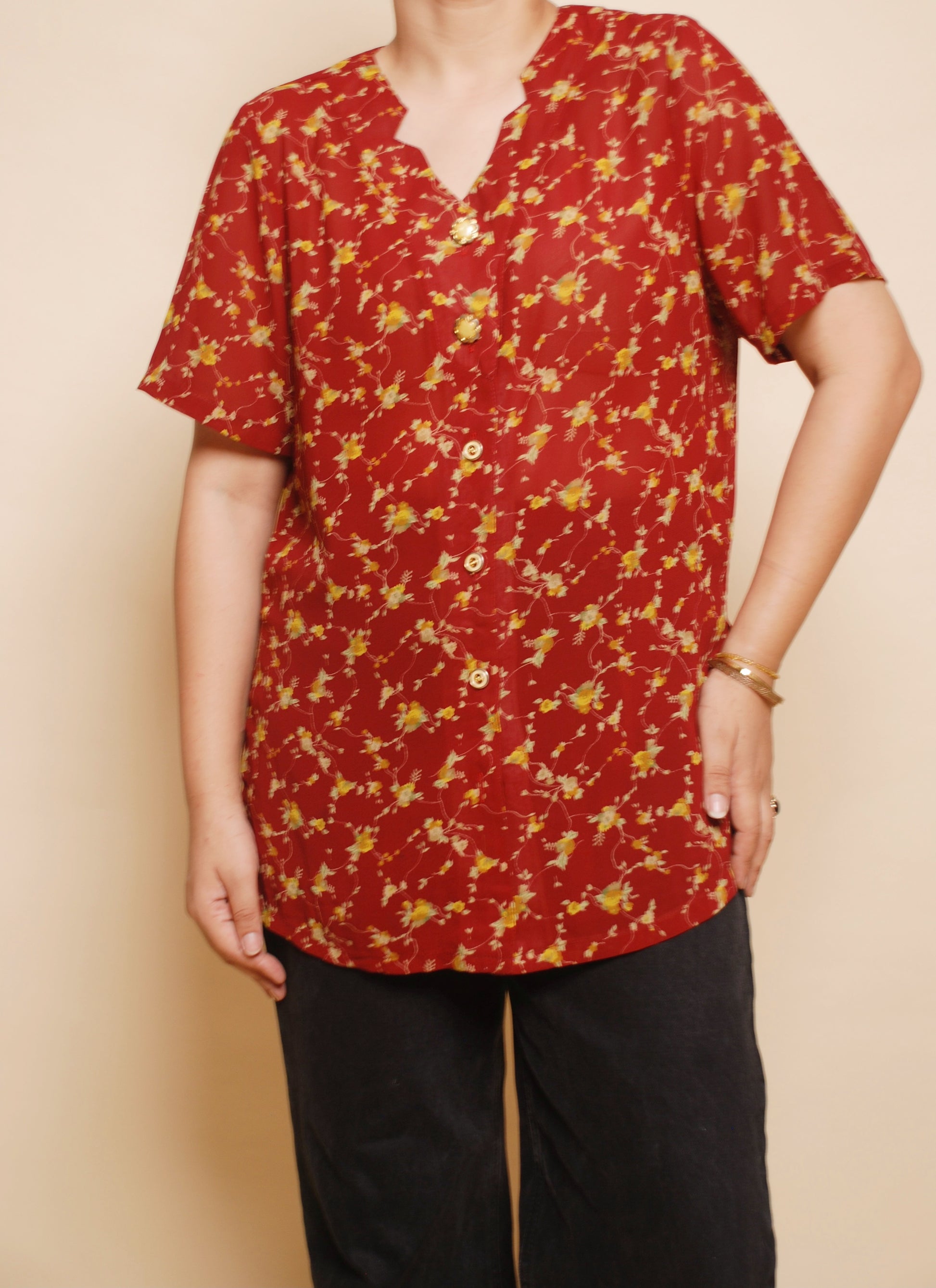 A short sleeve red blouse with beautiful yellow floral print all over. The blouse has a v-neckline, side slits and ornamental buttons.