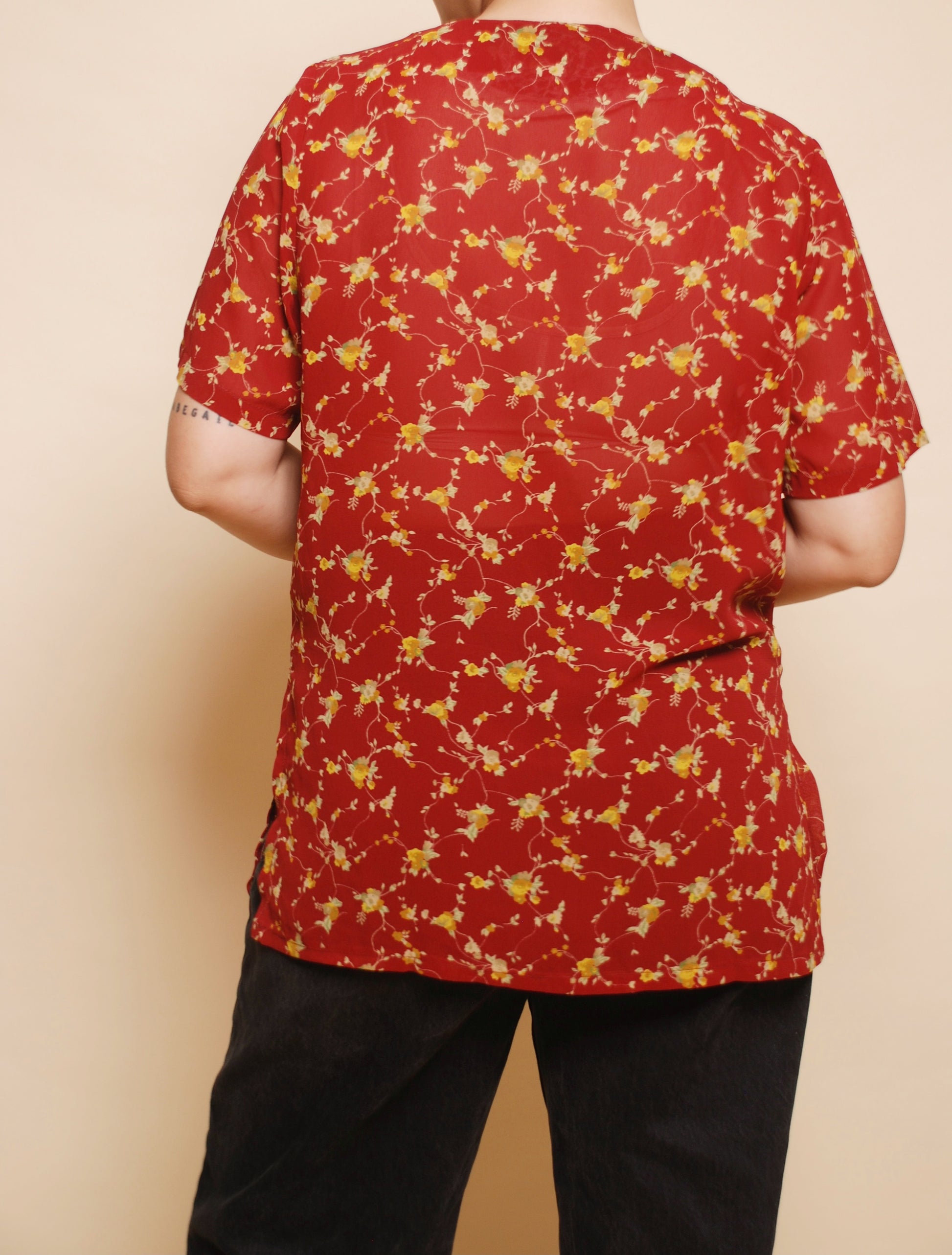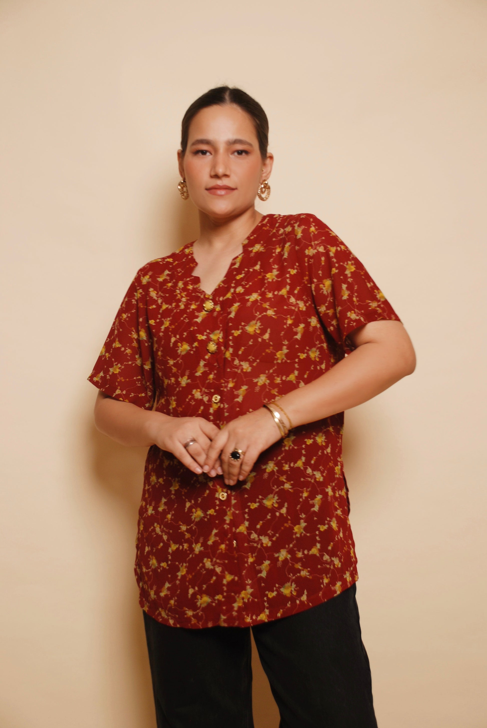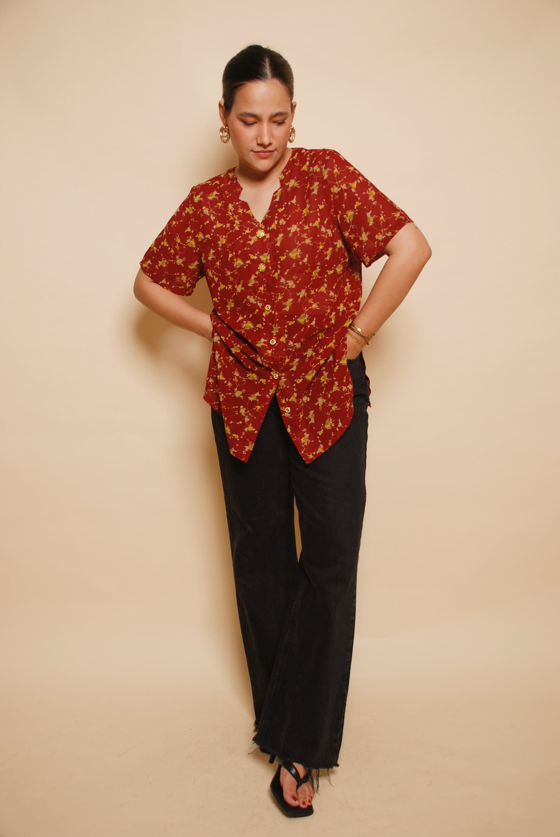 A short sleeve red blouse with beautiful yellow floral print all over. The blouse has a v-neckline, side slits and ornamental buttons.